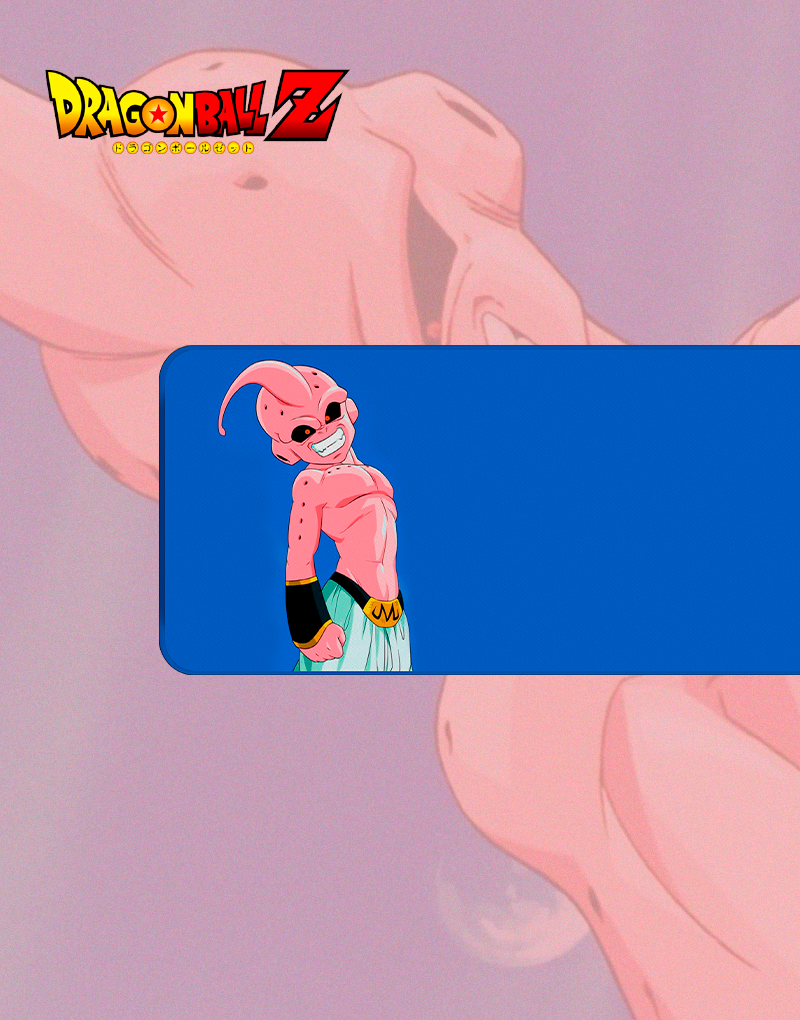 Diseño de Alto Contraste: El rosa chicle de Kid Buu resalta espectacularmente sobre el fondo azul profundo, con el símbolo Majin añadiendo un toque minimalista y siniestro.