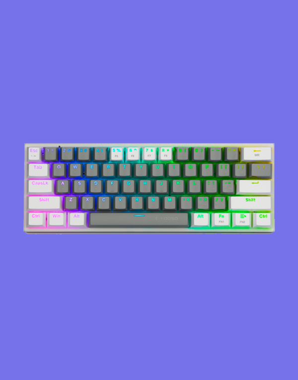 El E-YOOSO Z686 es un teclado mecánico compacto de diseño 65% con 68 teclas, que ofrece una combinación ideal de funcionalidad, estilo y portabilidad. Su acabado en color blanco y la iluminación RGB personalizable lo convierten en una pieza visualmente atractiva para cualquier espacio de trabajo o estación gamer.